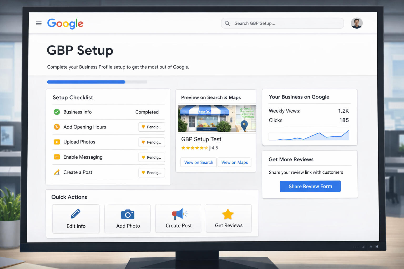 Complete Google Business Profile setup from scratch. We claim, verify, and optimize your profile with accurate business info, categories, photos, and hours.